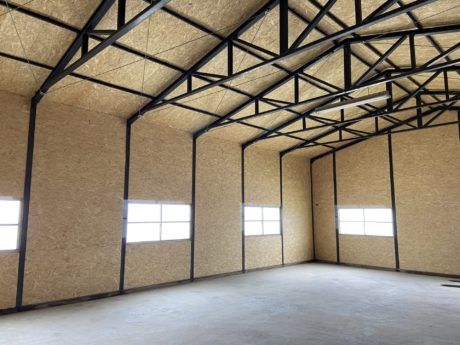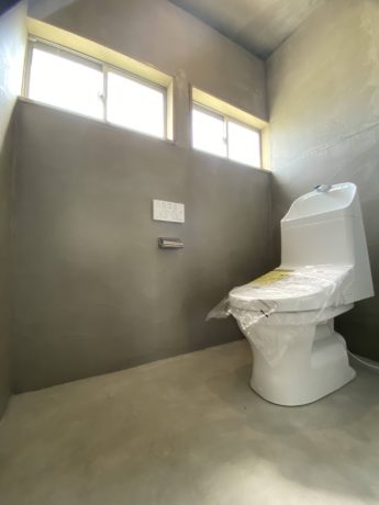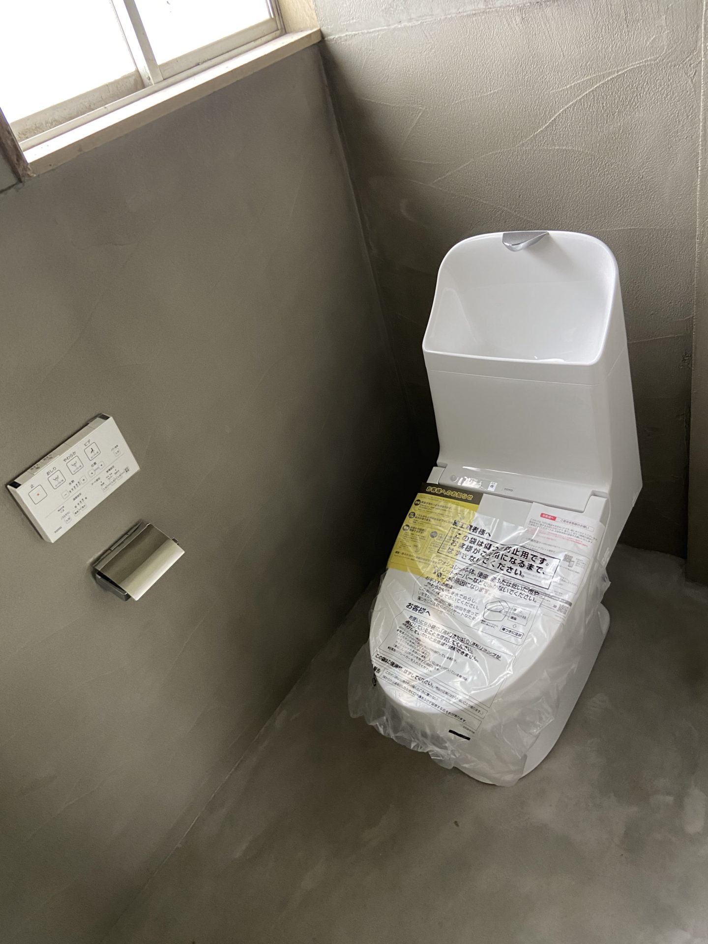 倉庫の内部は明るくOSB合板仕上げに、トイレは落ち着いたモルタル壁(TFアーテリア)へ、照明はLEDへ。