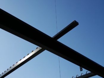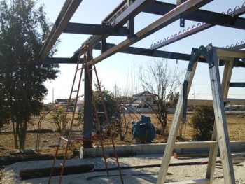 ![]() 晴天に恵まれました 梁の上には小さな山型がありますね 折半屋根の下地になります |