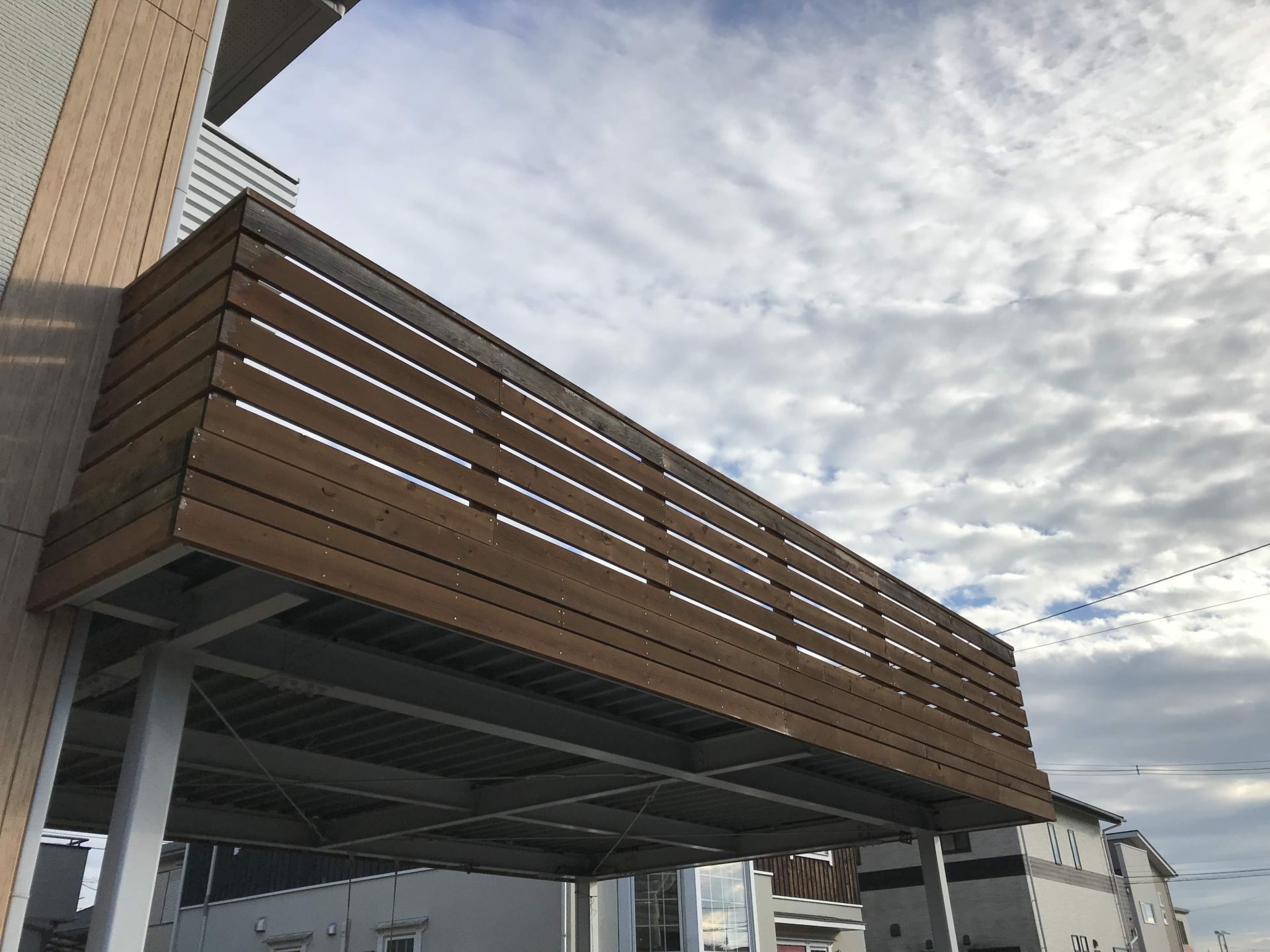 鉄骨製のカーポートの上にウッドデッキを載せてお庭2倍作戦です!